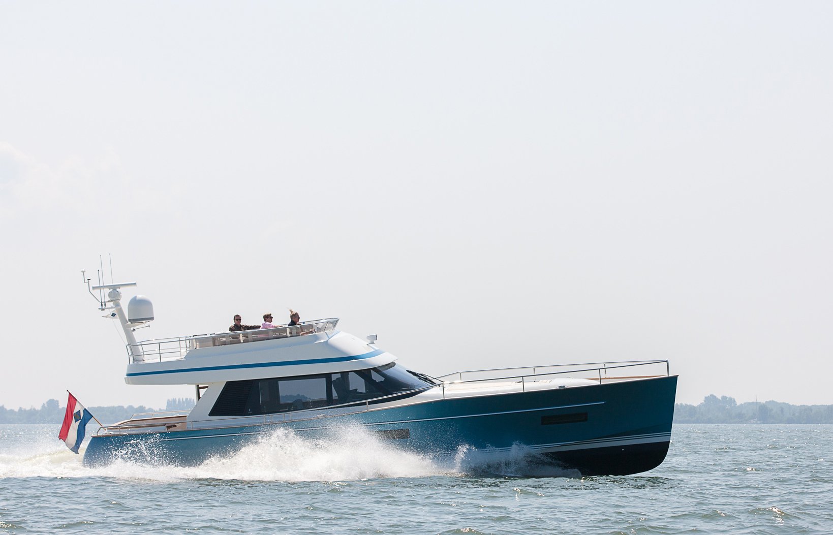Complementing the secure ride, the 52MC Flybridge’s extra wide walk-around decks and high bulwarks with sturdy handrails reinforce the design intent of absolute seaworthiness. Take in the extra detailing: the deftly integrated side boarding gates to either side, the cantilevering pilot’s deck door, and it’s a beguiling aesthetic. Then add to this the flybridge made extraordinary by its combination of eye-pleasingly low, sleek sportster lines. Its commanding view and joystick control. The stylish, ergonomic furnishings and the full outdoors experience whether piloting at speed or dining and reclining.